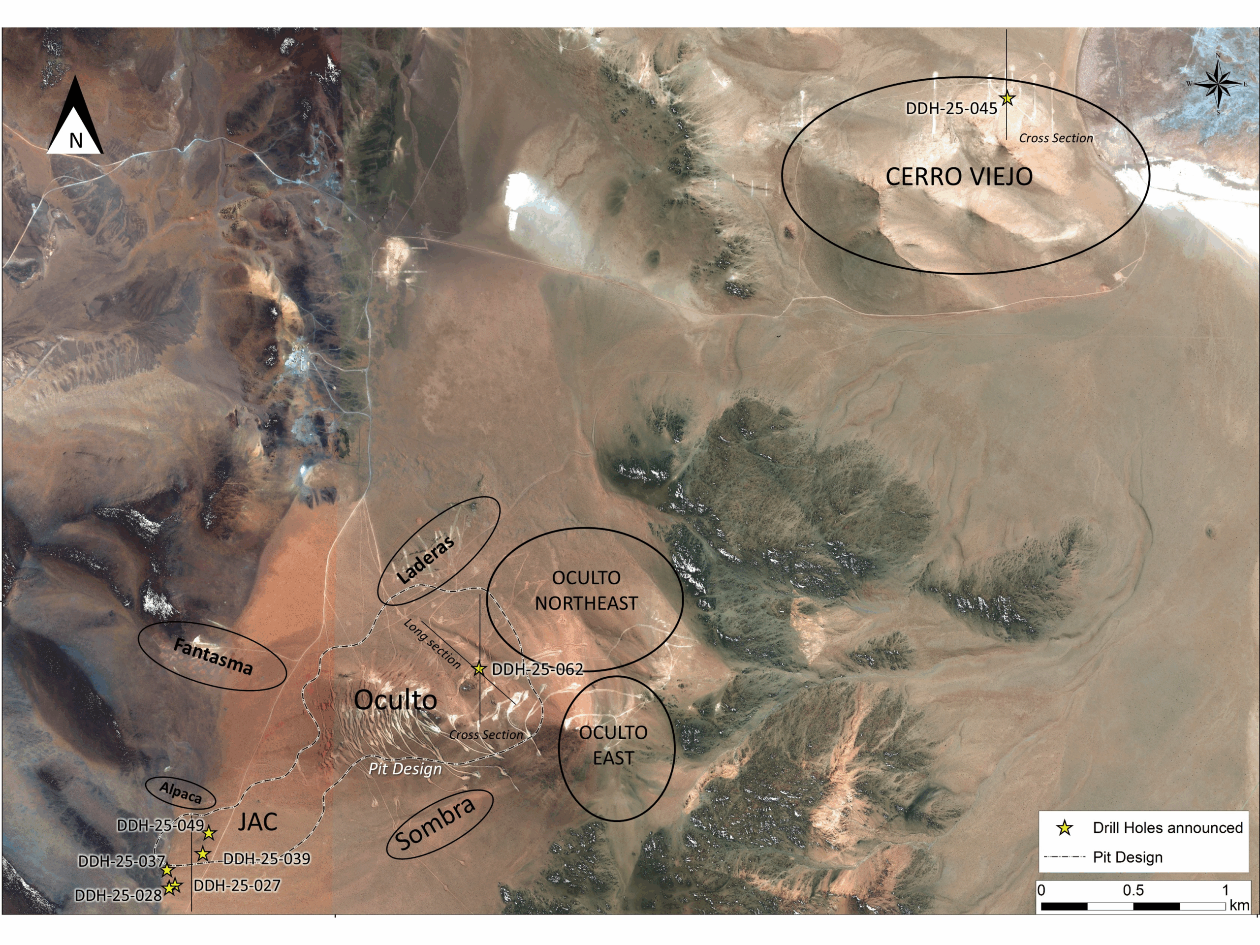 El pozo de salida DDH 25-062 interceptó un intervalo continuo de 42.0 metros («m») con una ley de 0.68 g/t de oro y 15 g/t de plata desde 248 m de profundidad, incluyendo un núcleo de mayor ley de 7.0 m con 1.67 g/t de oro y 17 g/t de plata. Este pozo fue perforado en Oculto East, más allá del borde oriental del actual tajo abierto conceptual, lo que confirma la extensión de la mineralización en un área previamente inexplorada.