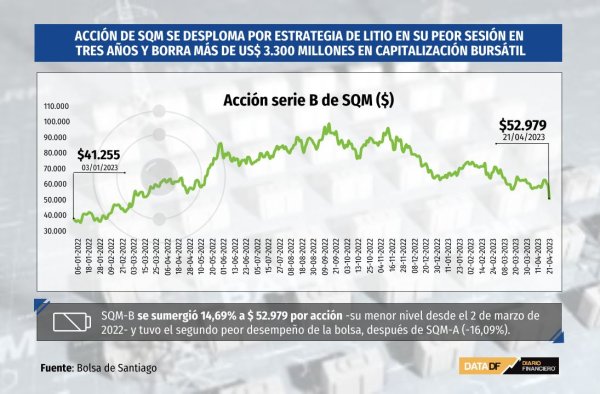 El protagonista de la jornada fue SQM, cuya acción serie B es la de mayor ponderación dentro del IPSA. SQM-B se sumergió 14,69% a $ 52.979 por acción -su menor nivel desde el 2 de marzo de 2022- y tuvo el segundo peor desempeño de la bolsa, superado por SQM-A (-16,09%).