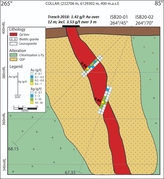 Las vetas de cuarzo muestreadas del núcleo de perforación son consistentes con el enriquecimiento con Au y el enriquecimiento concomitante de Pb y Ba en los ensayos informados de muestras de vetas superficiales. El enriquecimiento de Ba (4885 ppm), Pb (3346 ppm) y también Mo (262 ppm) y Sb (101 ppm) sugiere un sistema mineral complejo con quizás sobreimpresión de tipos de fluidos. Esto es particularmente sugerido por un ensayo de 1 m de 0.14 g / t Au, 3 g / t Ag y 4.885 ppm Ba de una veta de cuarzo a 128.5 m en el pozo ISB20-08 que inferiría la posibilidad de un sistema mineral profundo.