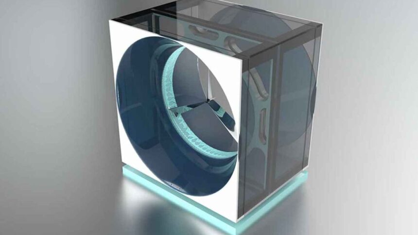 Sin base, la turbina es un cubo abierto en su centro por un túnel de viento donde se encuentra la hélice. Tal y como explican sus responsables, esta cámara aerodinámica permite acelerar la velocidad del viento para obtener más potencia. Además, las aspas se ensanchan hacia la punta para aprovechar mejor esa velocidad del viento.