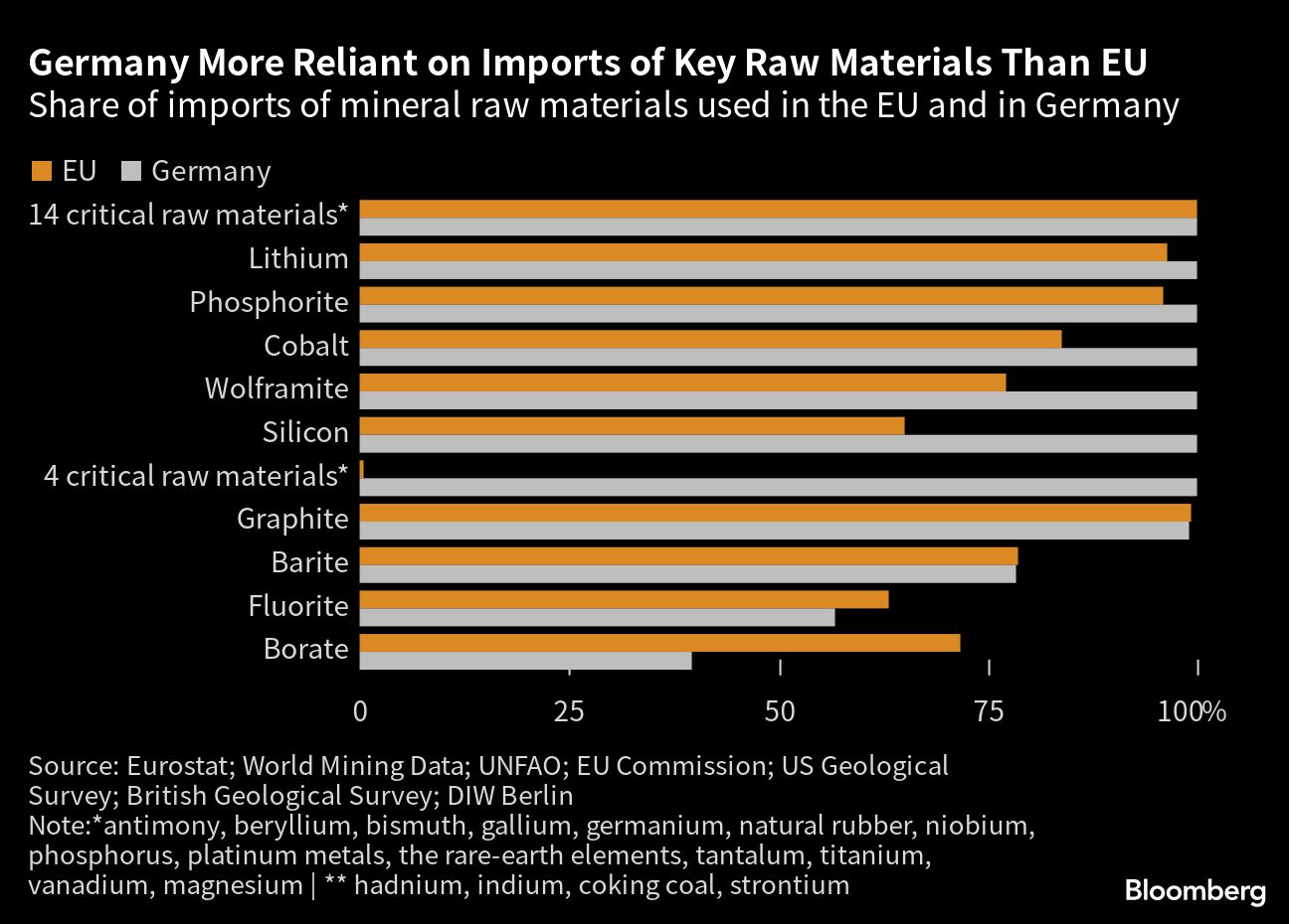 El papel fundamental de las materias primas como el cobalto, el cobre, el litio, el silicio y los metales de tierras raras en la producción de todo, desde turbinas eólicas hasta baterías para vehículos eléctricos, está impulsando los esfuerzos para garantizar el suministro en todo el mundo. Alemania depende de las importaciones para más del 90% de los productos básicos cruciales, según una investigación del grupo de expertos DIW Berlin, con China a la cabeza en el suministro de muchos insumos importantes.