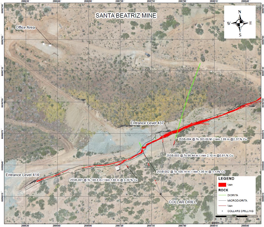 La veta Santa Beatriz está alojada en un complejo intrusivo de diorita, que va desde la diorita de grano grueso hasta la microdiorita. Las secciones poco profundas exhiben una fuerte alteración propilítica con epidota, clorita y pirita. El agujero 25SB-002 también interceptó cuarzo vuggy con epidota, lo que sugiere una sobreimpresión epitermal. En particular, las secciones más profundas del pozo 25SB-004 revelaron una intensa alteración potásica, feldespato K, biotita y magnetita asociadas con molibdenita y calcopirita menores. Esta alteración, observada solo a profundidades >250 m, se asemeja a la mineralización de tipo pórfido. Está pendiente un muestreo adicional de los intervalos de núcleo más profundos.