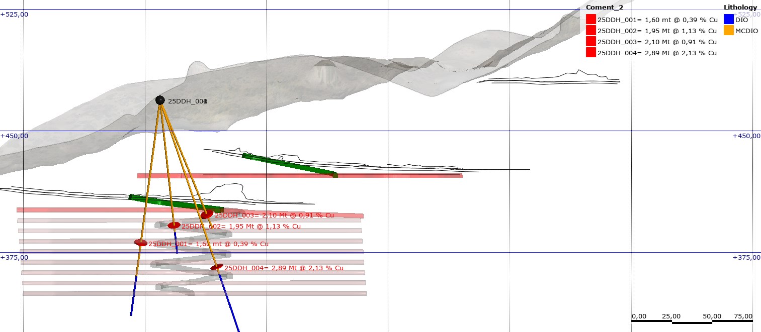 - Incluyendo 1,5 m con una ley de 4,11% Cu, 0,53 g/t Au y 35,11% Fe