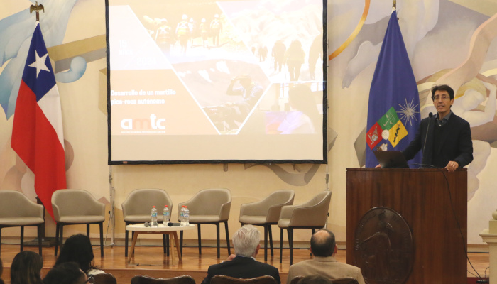 Seguidamente, el director ejecutivo del AMTC, Javier Ruiz del Solar, presentó uno de los actuales desarrollos del Centro, el martillo pica-roca autónomo, como ejemplo de lo imprescindible que es trabajar en conjunto con la industria para desarrollar íntegramente innovaciones exitosas y, en general, trabajar en investigación aplicada. “Como academia, no podemos hacer los recorridos desde un proyecto validado en laboratorio a un producto ya operativo en un ambiente real nosotros solos. No tiene sentido. Uno tiene que hacer pruebas con la industria, en el mundo real”, afirmó.
