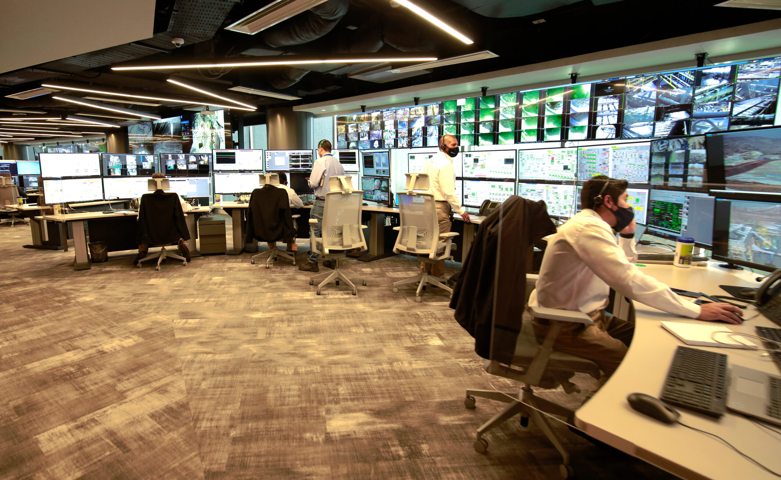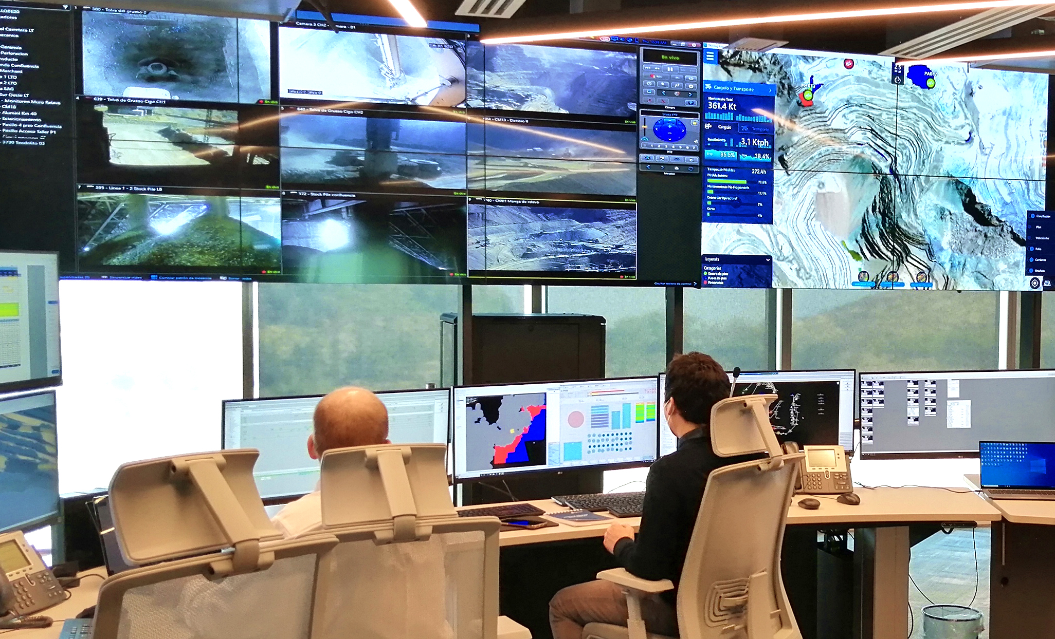 En IROC, alrededor de 100 personas desempeñarán sus funciones en un sistema de turnos. De ellas, más de un 80 % son operadores que antes debían subir a faena y que desde ahora trabajarán igual de conectados con la operación, pero desde Santiago, disminuyendo los tiempos de traslado y la exposición a las condiciones naturales y extremas de Los Bronces. El espacio, que es el cerebro digital de la operación del yacimiento cuprífero, cuenta con 32 estaciones de trabajo que reciben la información proveniente de la faena, donde están instaladas más de 700 cámaras que capturan los distintos procesos que tiene la mina para extraer y procesar los minerales. Estas imágenes y la información que se obtiene se transmiten por conexiones de fibra óptica para mantener la seguridad de la comunicación, hasta la oficina remota donde se distribuyen en 150 pantallas de última generación, un videowall con 50 servidores, y distintos sistemas computacionales que sirven para analizar datos y procesos.
