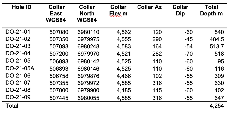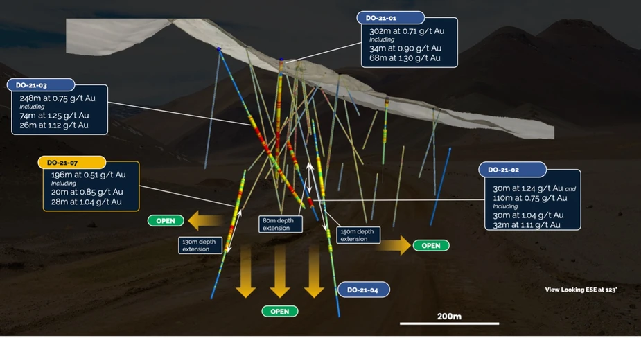 El pozo DO-21-07, que tenía como objetivo probar el potencial de profundidad debajo del pozo DO-21-03, arrojó 196 ma 0.51 g / t Au e incluyó 28 ma 1.04 g / t Au. Se experimentaron leyes consistentemente altas (hasta 4.06 g / t Au (más de 2 m)) en esta Fase I inicial de perforación de prueba. Estos incluyen leyes superiores a 1 g / t Au en múltiples intersecciones largas de hasta 74 m en material de óxido. Se han identificado nuevas zonas y la mineralización permanece abierta al NE, SO y en profundidad. Se ha completado un total de 4.255 m de perforación y los pozos 8 y 9 están pendientes de análisis.