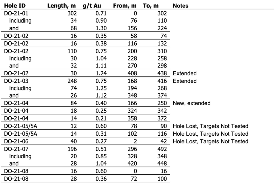 Ley alta: Los resultados de la Fase I demuestran el potencial de ley más alto del depósito (68 ma 1.30 g / t Au comenzando en 156 m en DO-21-01, y 74 ma 1.25 g / t comenzando en 194 m en DO- 21-03) con intersecciones superiores a 1 g / t Au en muchos hoyos.