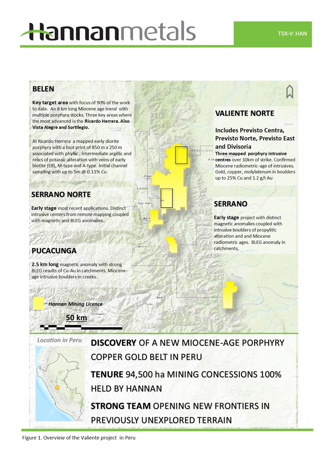 Hannan Metals Limited («Hannan» o la «Compañía») (TSXV: HAN) (OTC PINK: HANNF) ha anunciado la recepción de la aprobación ambiental para su primer programa de perforación en el prospecto Belen, parte del proyecto de cobre-oro Valiente, propiedad completa de la compañía, ubicado en Perú.