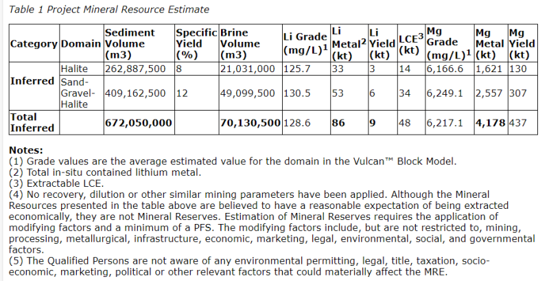 El MRE para el proyecto de litio Candela II se informa de acuerdo con NI 43-101 y se ha estimado de conformidad con las pautas de mejores prácticas de estimación de recursos minerales y reservas minerales generalmente aceptadas del Instituto Canadiense de Minería, Metalurgia y Petróleo. La fecha de vigencia del MRE es el 18 de septiembre de 2023. Se aplicaron valores promedio de rendimiento específico, por dominio, a los tonelajes totales de metal para obtener el rendimiento de la salmuera disponible. El LCE se calcula a partir de la relación entre carbonato de litio (Li2CO3) y Li (5,32:1). Los cálculos no asumen pérdidas en el proceso.