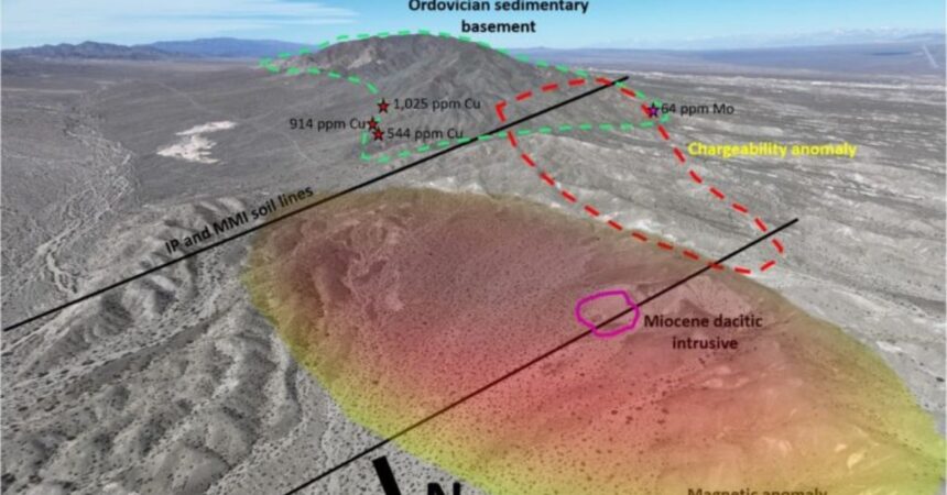 La Compañía está planificando la extensión de los suelos MMI y estudios geofísicos sobre toda la propiedad para definir objetivos de perforación en la búsqueda de centros de pórfido ciegos del Mioceno debajo de las gravas cuaternarias.