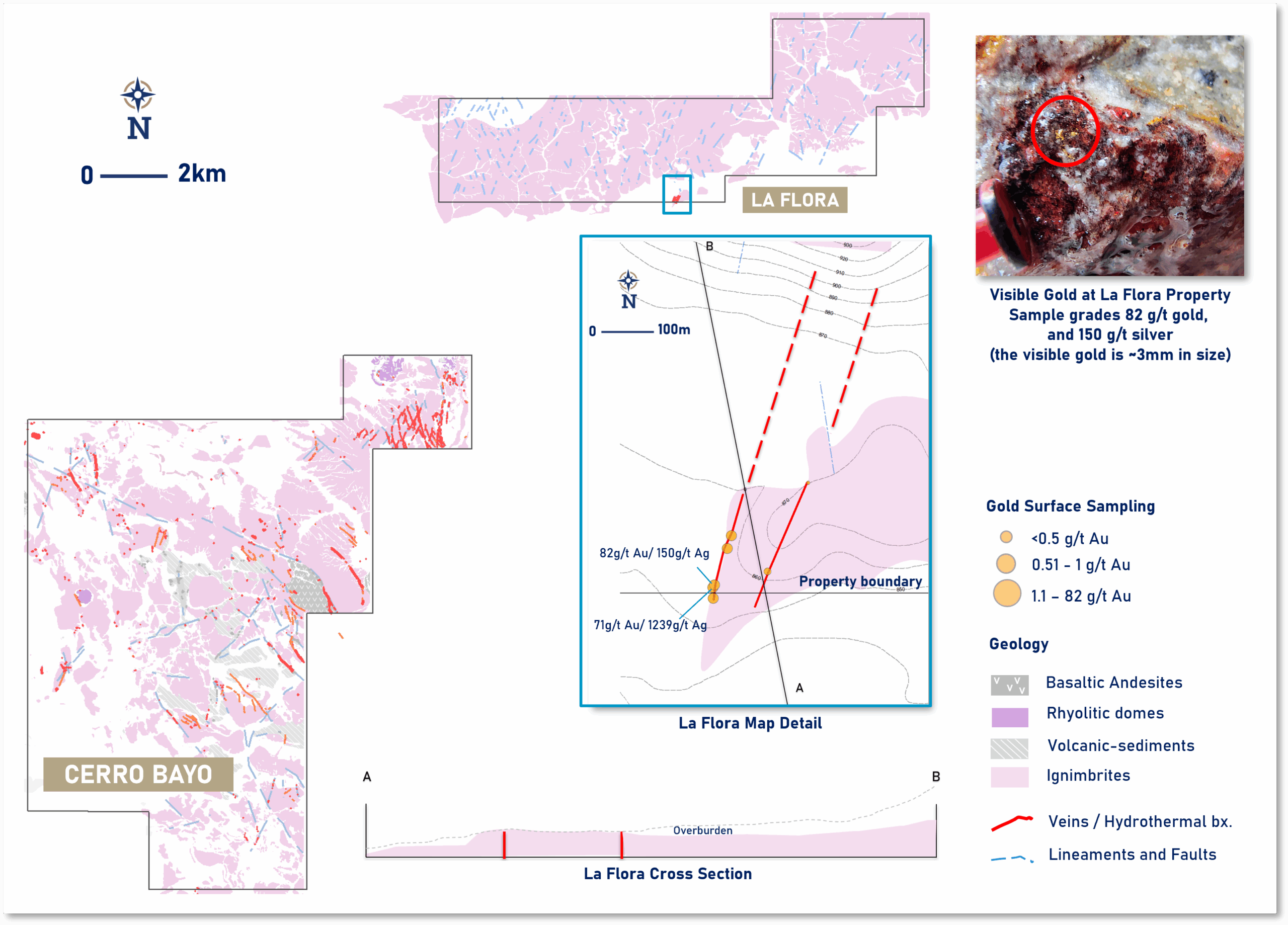 Se recolectaron muestras de dos estructuras de afloramiento donde se observó oro visible como parte de un evento de sílice gris microgranular dentro del área del proyecto La Flora. Los resultados de los ensayos de estas muestras arrojaron valores de hasta 82 g/t de oro y 1.239 g/t de plata. Hacia el norte, estas estructuras están ocultas bajo el material de sobrecarga y será necesario realizar más pruebas de estas vetas de grado de bonanza como parte de futuras perforaciones.