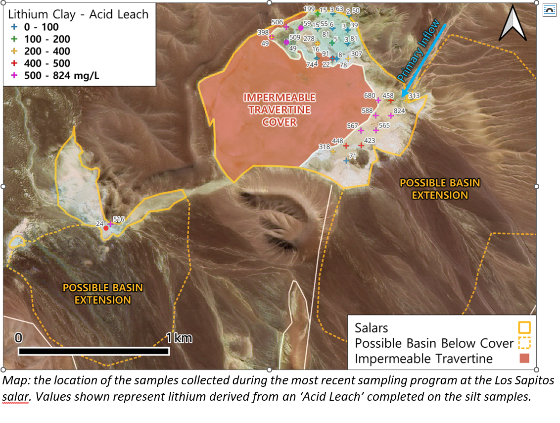 Los resultados preliminares del muestreo en curso en Los Sapitos son alentadores. Una serie de muestras de limo recolectadas del salar de Los Sapitos se trataron con un lavado con ácido y agua purificada. Los resultados muestran que se encuentra una cantidad significativa de litio tanto en las arcillas como en la mineralización de evaporitas en el margen oriental de la cuenca, con resultados de hasta 824 mg/L en las muestras más orientales recolectadas hasta la fecha.