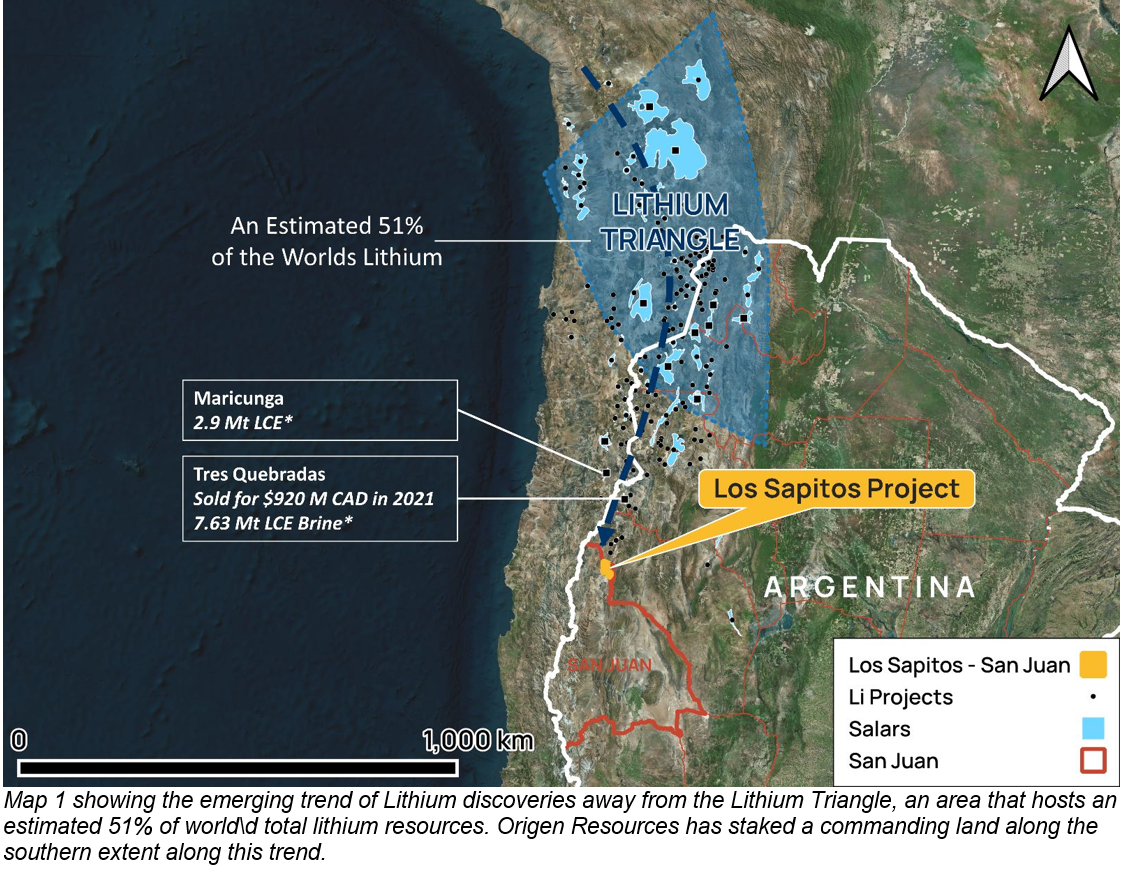 Origen reconoció previamente que la geología de la provincia norteña de San Juan, favorable a la minería, era similar a la de los cinturones de litio en el norte del país. Guiado por este modelo de exploración, Origen pudo adquirir un paquete de terreno contiguo del tamaño de un distrito alrededor de un salar mayormente enterrado. La exploración preliminar en 2021 tuvo un éxito inmediato: leyes sorprendentemente altas de litio en salmueras en la superficie en el área salar principal de Los Sapitos, con una muestra que arrojó 391 mc/l. Este descubrimiento fue una reivindicación del modelo de exploración.