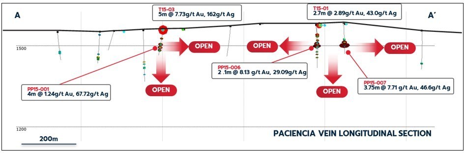 - PP15-006: 2,1 metros con ley de 8,13 g/t de oro y 29,1 g/t de plata dentro de un intervalo más amplio de 21 metros con ley de 1,69 g/t de oro y 22,1 g/t de plata