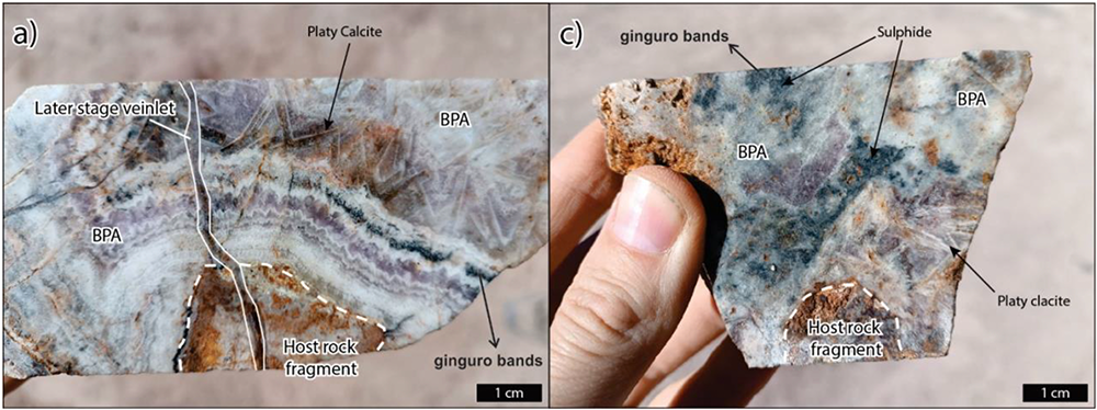 El Evento 2 está compuesto por dos etapas: BPA (Bladed calcite & adularia bands) está formada por cuatro texturas sucesivas coloformo-crustiformes bandeadas y brechas compuestas por pulsos de sílice recristalizada, calcedonia y carbonato acompañados de calcita laminar, amatista, adularia y sulfuros relacionados con bandas de ginguro oscuras (Figura 7). BxSi (brecha silícea) es una brecha tectónica e hidrotermal con cemento silíceo y sulfuros diseminados.