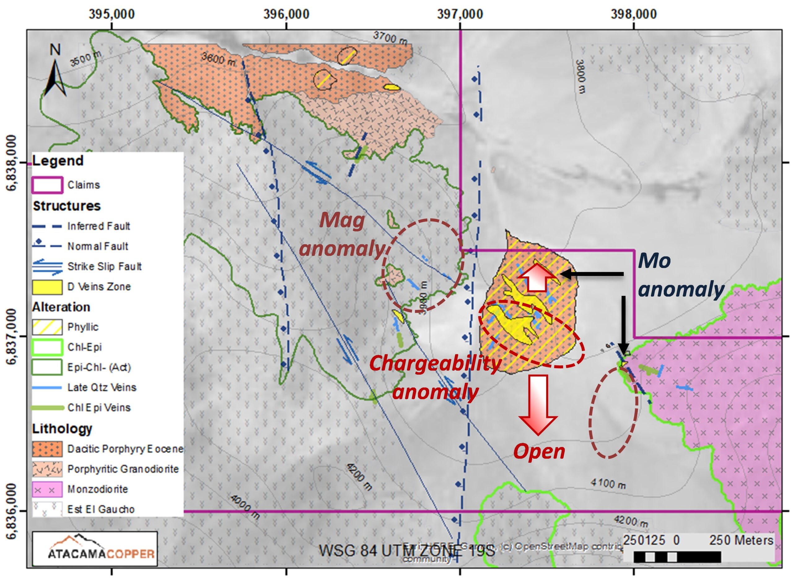 El programa de trabajo hasta la fecha ha identificado dos objetivos de alta prioridad con atributos prospectivos críticos requeridos en un sistema de pórfido mineralizado. Sin embargo, se sabe que el distrito alberga localmente pórfidos y domos subeconómicos emplazados en las últimas etapas de los depósitos de pórfidos, lo que podría disfrazar o enmascarar la mineralización económica en una etapa temprana de la perforación. Este fue el caso en el depósito vecino de Relincho, donde la perforación inicial enfrentó parte de las unidades de bajo contenido de sulfuro y baja mineralización antes, en última instancia, del descubrimiento del sistema de pórfido mineralizado completo. En consecuencia, se considera necesario definir la presencia y distribución relativa de sulfuros de cada objetivo a través de un levantamiento geofísico IP de seguimiento. La prospección cubrirá entre 10 y 20 km de longitud en los dos objetivos de alta prioridad enfocados en las zonas de capa de lixiviación y cubriendo las anomalías magnéticas. Esto proporcionará una excelente herramienta para la perforación dirigida para probar la presencia de la mineralización hipogénica y supergénica esperada.