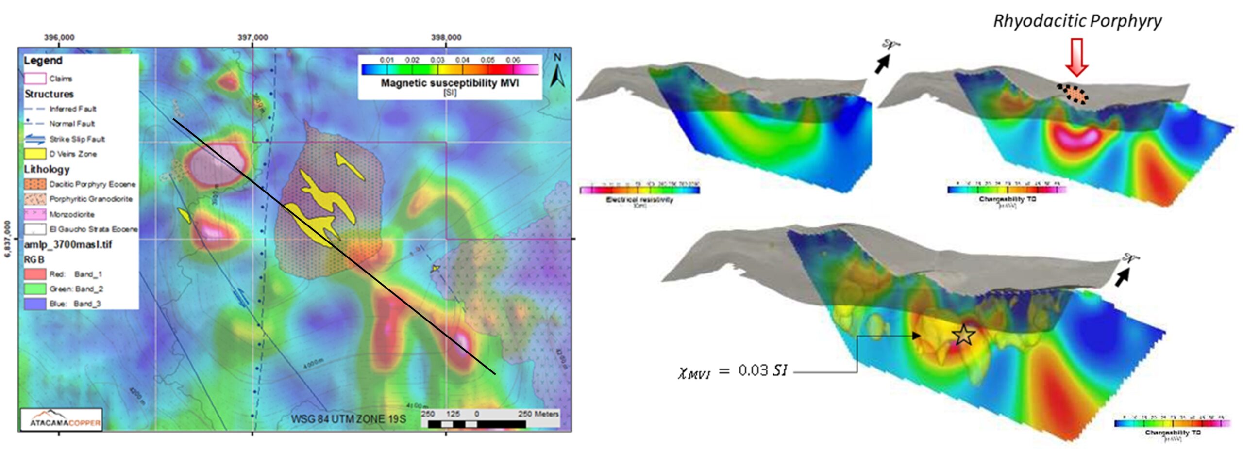 El perfil IP de 4 km de largo alcanzó una profundidad de casi 1.000 m. El perfil fue diseñado para abarcar las anomalías magnéticas NW y SE (Fig. 7). La anomalía más significativa está en la anomalía central, que reúne todos los aspectos deseables para la mineralización de sulfuros: conductor moderado de alta cargabilidad intensa centrado, pero irradiando fuera de una anomalía magnética moderada-alta. La presencia del pórfido alterado fílicamente, la anomalía IP, junto con la magnetometría terrestre, está configurando un nuevo objetivo de pórfido no probado consistente de 2 x 1 km con potencial hacia el sur y en profundidad.