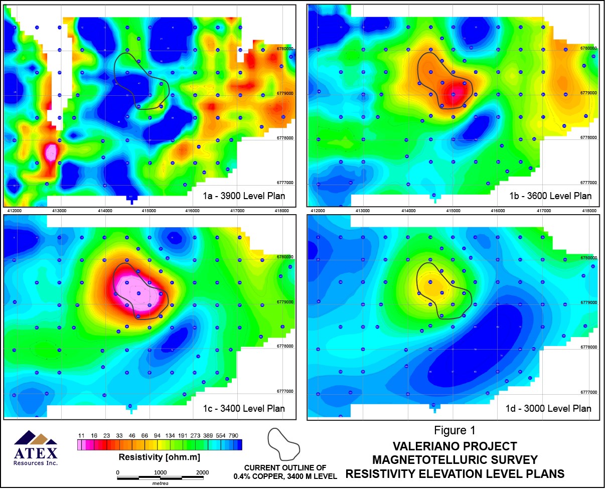 ATEX Resources Inc. (TSXV: ATX) (» ATEX «) se complace en anunciar que el estudio geofísico magnetotelúrico de penetración profunda (» MT «) recientemente completado sobre la propiedad Valeriano, logró establecer una clara correlación entre la mineralización que comprende el depósito de cobre y oro Valeriano, una anomalía de cargabilidad subcircular de tres kilómetros de diámetro y una anomalía de resistividad extensa que se extiende significativamente a la profundidad. La anomalía de resistividad, el foco de la campaña de perforación actual, está asociada con intersecciones de perforación de cobre y oro de mayor ley de la perforación histórica.