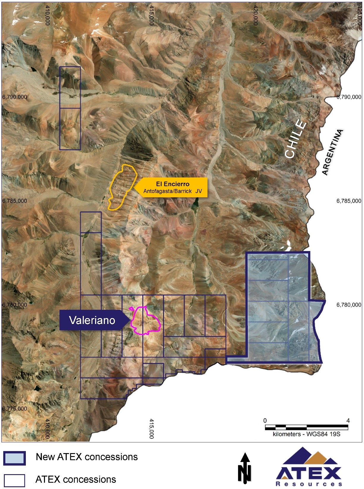 ATEX está explorando el Proyecto de Oro y Cobre Valeriano, que se encuentra dentro del cinturón mineral de pórfido de oro y cobre emergente que une el prolífico Cinturón de Alta Sulfuración de El Indio al sur con el Cinturón de Pórfido de Oro de Maricunga al norte. Este cinturón emergente, conocido informalmente como Link Belt, alberga varios depósitos de pórfido de oro y cobre en diversas etapas de desarrollo, incluidos Filo del Sol (Filo Mining), Josemaría (Lundin Mining), Los Helados (NGEX Minerals/JX Nippon), La Fortuna (Teck Resources/Newmont) y El Encierro (Antofagasta/Barrick Gold).