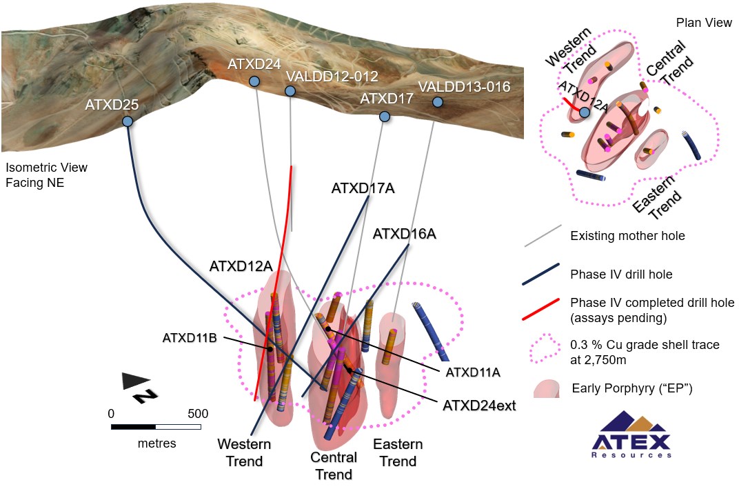 - El primer pozo intentado en la Fase IV fue la continuación de ATXD-24* (670 metros de 0,84% de cobre equivalente «CuEq» (0,60% Cu, 0,24 g/t Au & 101 ppm Mo), informó 13 de julio de 2023, incluidos 312 metros de 1,00 % CuEq (0,73 % Cu, 0,30 g/t Au y 77 ppm Mo)) que se suspendió en una profundidad de 1,842 metros en EP dentro del Tendencia Central, al finalizar la Fase III. Múltiples intentos de reiniciar el hoyo no tuvieron éxito, y las complicaciones dentro del hoyo finalmente resultaron en la decisión de salir del hoyo y pasar a uno nuevo. La mineralización intersectada en ATXD-24 permanece abierta hacia el este y se están evaluando otros planes para darle seguimiento.