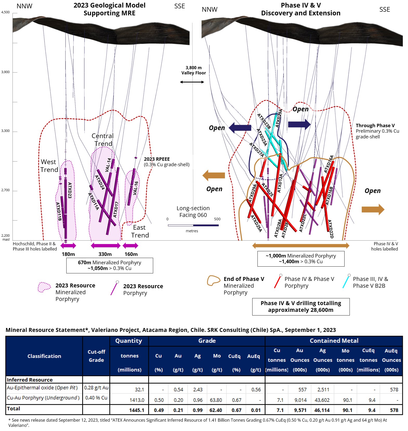 ATEX Resources Inc. (TSXV: ATX) («ATEX» o la «Compañía«) se complace en anunciar los resultados de los ensayos para ATXD25C, ATXD27B y ATXD28, que representan los últimos tres pozos de perforación en el programa de perforación de la Fase V, concluyendo la campaña más exitosa en el Proyecto de Cobre-Oro Valeriano («Valeriano» o el «Proyecto«), ubicado en la Región de Atacama, Chile. ATEX planea comenzar su programa de perforación de Fase VI a principios de septiembre con más detalles que se proporcionarán más cerca del inicio del programa.