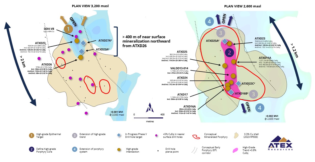 Los dos pozos de perforación de importancia en el programa de la Fase IV fueron ATXD16A y ATXD26. ATXD16A demostró que el núcleo de pórfido de alta ley estaba abierto hacia el sureste con el potencial de extensión en el programa de perforación de la Fase V2. ATXD26 fue el último pozo de perforación completado en la Fase IV, y no solo produjo el intervalo de ley más alto visto en el Proyecto hasta la fecha, incluyendo 68 metros con una ley de 2.02% CuEq (1.39% Cu, 0.60 g/t Au, 3.81 g/t Ag, 473 g/t Mo)3, pero también descubrió un nuevo estilo de mineralización alojada en brechas enriquecidas y sobreimpresas que no se había identificado anteriormente en el Proyecto. Esta mineralización también se encuentra por encima del cuerpo de pórfido, más cerca de la superficie y en un área no probada previamente que corresponde a una característica mucho más grande fotografiada en estudios geofísicos. Esta mineralización podría representar el potencial para una mina inicial independiente que reduciría significativamente el riesgo de la economía potencial del proyecto, adelantaría el flujo de caja y financiaría el desarrollo y la expansión de la producción de la mineralización relacionada con el pórfido en profundidad.
