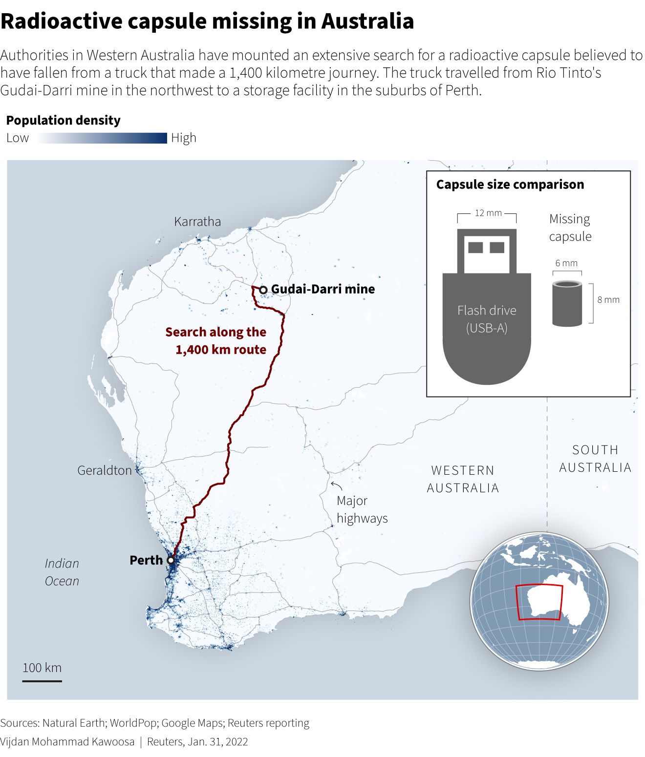 Se cree que la cápsula se cayó de un tren de carretera, un camión con múltiples remolques, que realizó un viaje de 1.400 km (870 millas) en Australia Occidental y su pérdida ha desencadenado una alerta de radiación en gran parte del vasto estado.