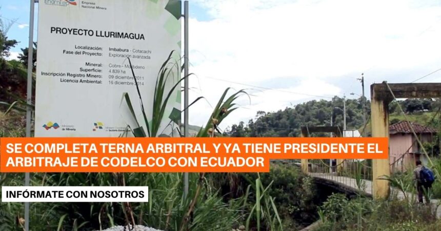 El caso se remonta a la fallida asociación entre la estatal chilena con la Empresa Nacional de Minería de Ecuador (Enami EP) para el desarrollo de un proyecto de cobre en el Valle del Intag, denominado Llurimagua. El británico John Beechey asumió como presidente de la terna del tribunal arbitral, el que ya se constituyó el pasado 22 de junio.