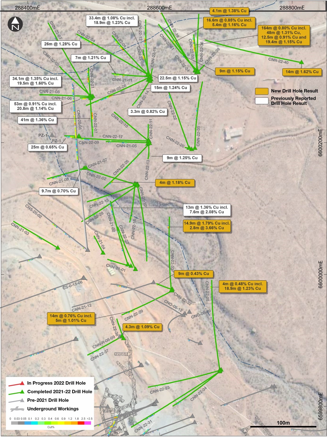 • CNN-22-30: 164 m al 0,80 % Cu , incluidos 48,0 m al 1,31 % Cu, 12,5 m al 0,91 % Cu y 19,4 m al 1,15 % Cu