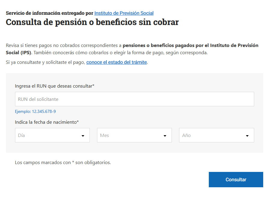 • Con el RUN y fecha de nacimiento, accede a la información para saber si tiene beneficios pendientes de cobro. De ser así, con la ClaveÚnica puede revisar el detalle.