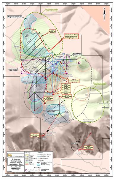 Figura 1: Geología del complejo Iska Iska Caldera que muestra las ubicaciones de los objetivos de Major Breccia Pipe, la zona objetivo de definición de recursos de Santa Bárbara y las perforaciones diamantinas completadas y planificadas.