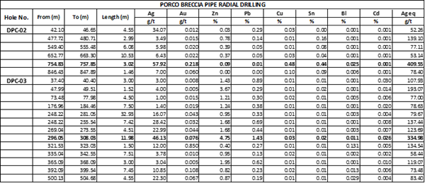 El pozo DCN-04 perforado a -80 grados al norte desde la plataforma radial norte de la CBP, interceptó diecisiete (17) intersecciones mineralizadas, principalmente con contenido de Sn-Ag, en su longitud de 851,4 m. Los mejores resultados incluyen: 71,54 g Ag eq/t (32,58 g Ag/t y 0,10 % Sn) en 97,10 m desde 134,40 hasta 231,5 m; 101,52 g Ag eq/t (28,74 g Ag/t y 0,19 % Sn) sobre 62,01 m; 70,42 g Ag eq/t (28,74 g Ag/t y 0,16 % Sn) sobre 22,59 m; y 236,96 g Ag eq/t (92,21 g Ag/t y 0,25% Sn) sobre 17,45 m. El pozo DCS-02 se perforó al sureste a -60 grados desde la plataforma radial sur del CBP. Este pozo, que se perforó a 800,5 m, interceptó nueve (9) intervalos mineralizados de Ag-Zn-Pb-Sn reportables. Los mejores resultados incluyen 79,53 g Ag eq/t (incluido 0,21 % Sn) sobre 19,42 m, 101,01 g Ag eq/t (32,76 g Ag/t, 0,76 % Zn, 0,75 % Pb) sobre 10,47 y 130,95 g Ag eq/t ( 34,14 g Ag/t, 0,10 g Au/t, 1.