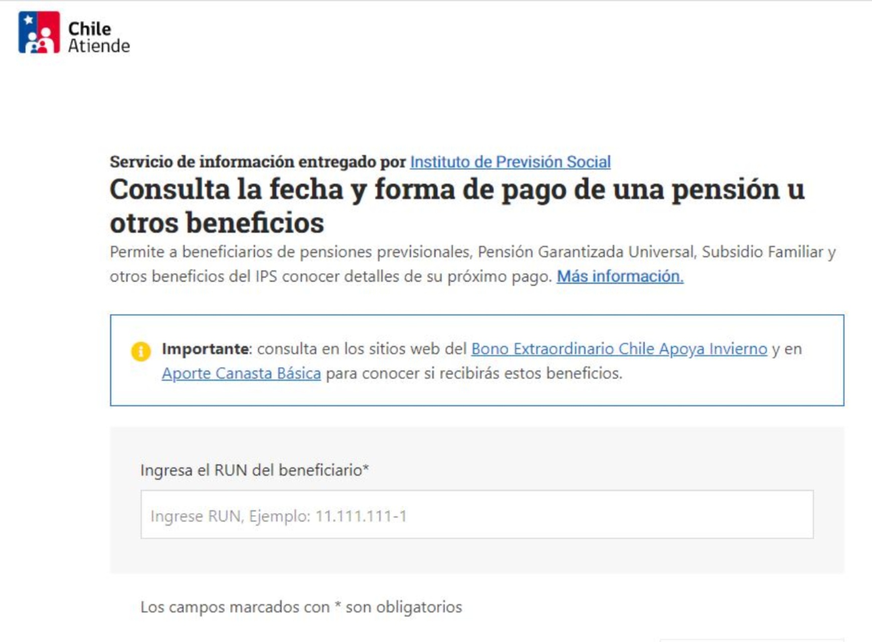 Al mismo tiempo, el Instituto de Previsión Social (IPS) y Chile Atiende ofrecen una plataforma en que los usuarios pueden consultar la respectiva fecha y forma de pago de los principales beneficios que entrega el Estado.