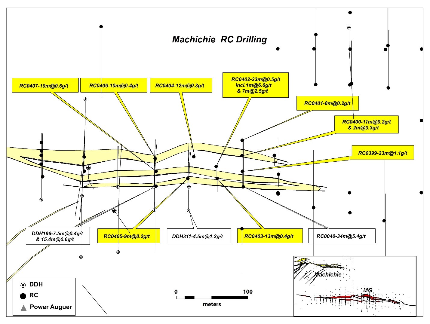 Los pozos de perforación RC399, RC 400 y RC401 se perforaron en la sección 553180 en la parte este del descubrimiento Machichie (Figuras, 1 y 2, Tabla 1). Los pozos fueron diseñados para dar seguimiento a la zona de mayor ley de mineralización de oro en óxido intersectada en el pozo RC RC040 que previamente arrojó 34 m @ 5,4 g/t de oro desde la superficie, incluidos 13 m @ 13,4 g/t de oro de 18 m de fondo del pozo ( ver nota de prensa del 7 de enero de 2021).