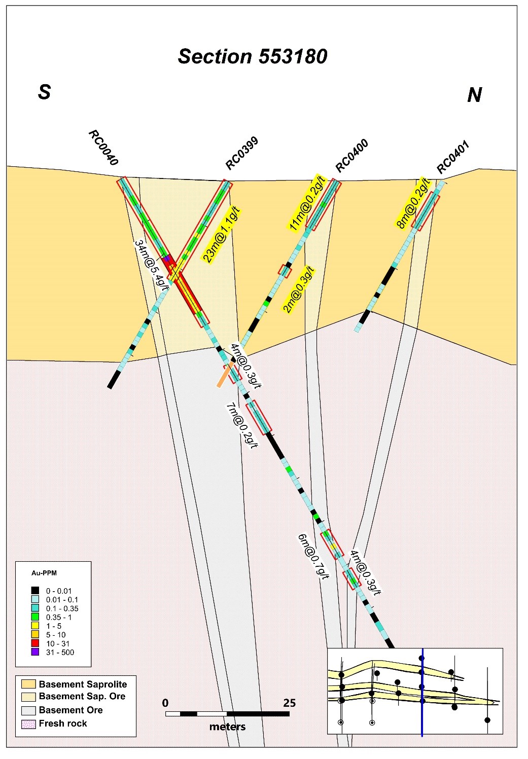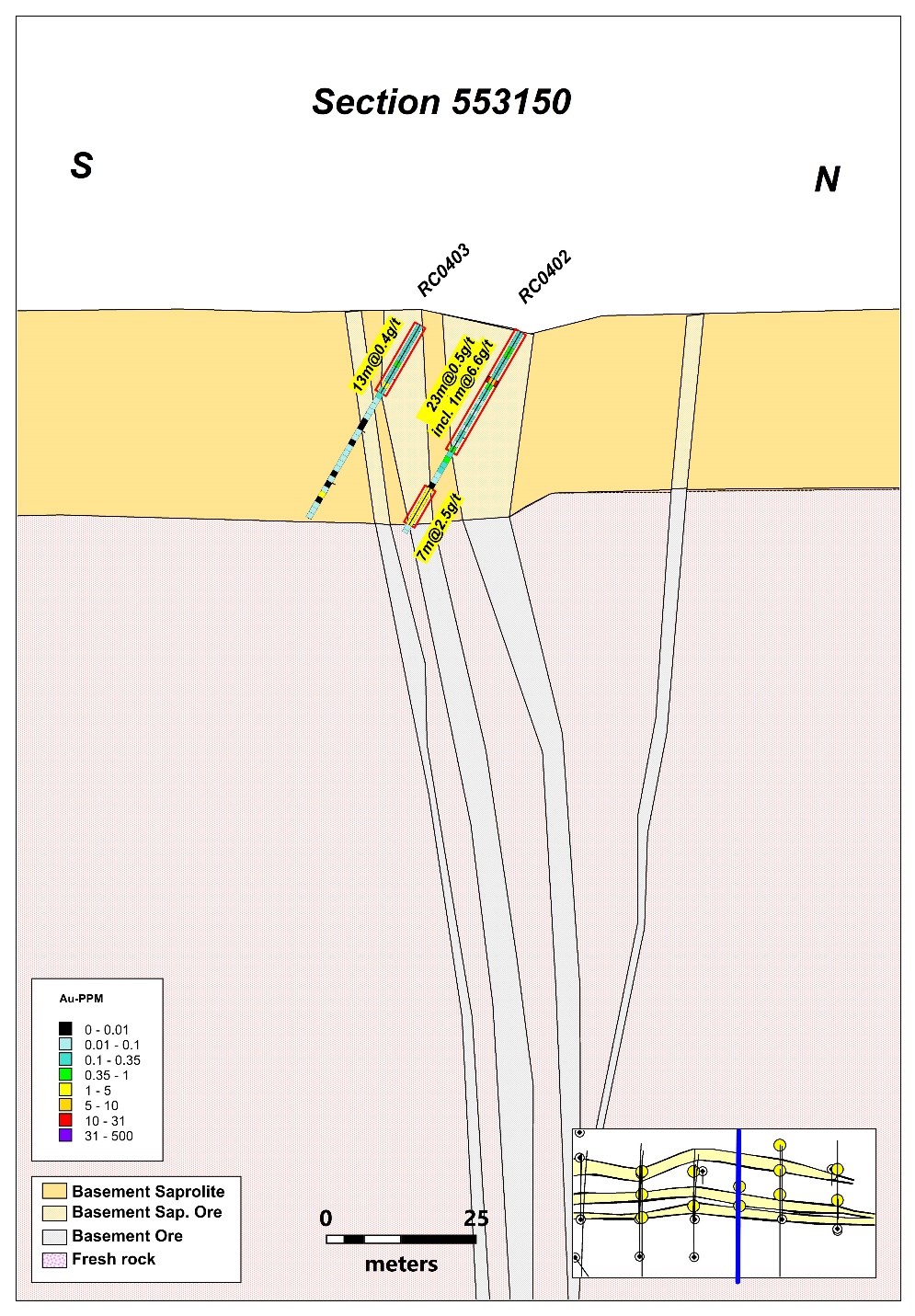 Se perforaron los orificios RC406, RC407 y RC408 en la sección 553055 (Figuras 1 y 4, Tabla 1). Perforaciones anteriores habían encontrado múltiples zonas subverticales mineralizadas en esta sección. Por ejemplo, DDH196 cortó dos zonas de inmersión vertical, devolviendo 12,5 m a 0,4 g/t de oro en el material de saprolita de óxido de oro cerca de la superficie y 10,4 m a 0,7 g/t de oro en el material de roca dura inmediatamente debajo de la saprolita. RC406 y RC407 confirmaron que ambas zonas se extienden a la superficie en saprolita del sótano, arrojando 10 m @ 0,6 g/t de oro y 10 m @ 0,4 g/t de oro, respectivamente.