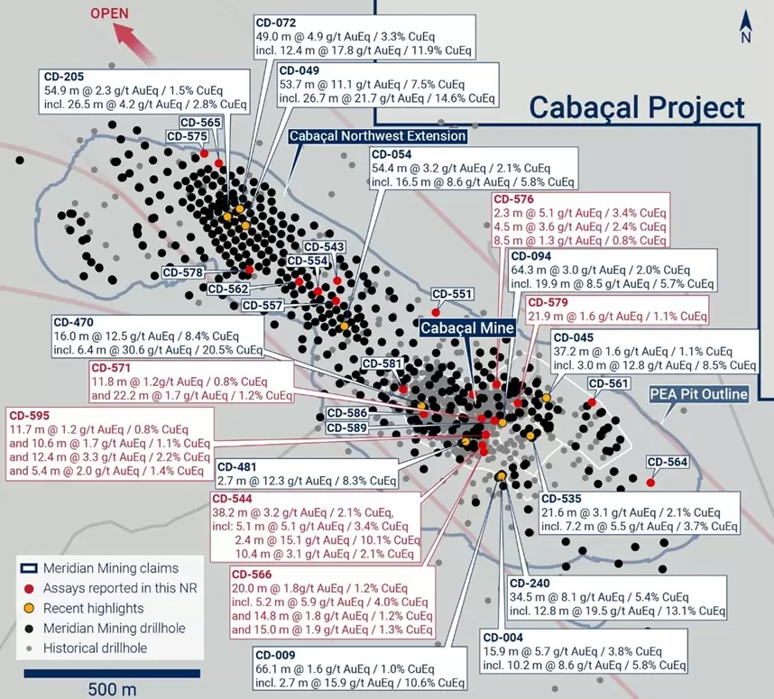 Meridian Mining UK S (TSX:MNO) (Frankfurt/Tradegate:2MM) (OTCQX:MRRDF) («Meridian» o la «Compañía») se complace en anunciar nuevos resultados sólidos de su proyecto avanzado Cabaçal Cu-Au-Ag («Cabaçal»), ubicado en el estado de Mato Grosso, Brasil. Múltiples zonas amplias de mineralización de Cu-Au-Ag apilada sobreimpresa por un evento de oro en etapa posterior, continúan siendo definidas y extendidas, destacadas por el ensayo CD-544: 38.2m @ 3.2g/t AuEq o 2.1% CuEq, CD-595 ensayando 12.4m @ 3.3g/t AuEq o 2.2% CuEq, y CD-571 ensayando 22.2m @ 1.7 g/t AuEq o 1.2% CuEq («Figura 1»). Estos representan solo una pequeña selección de los muchos resultados sólidos obtenidos hasta la fecha dentro del tajo abierto de PEA1 («Tabla 1»). Más resultados de Cabaçal están pendientes.
