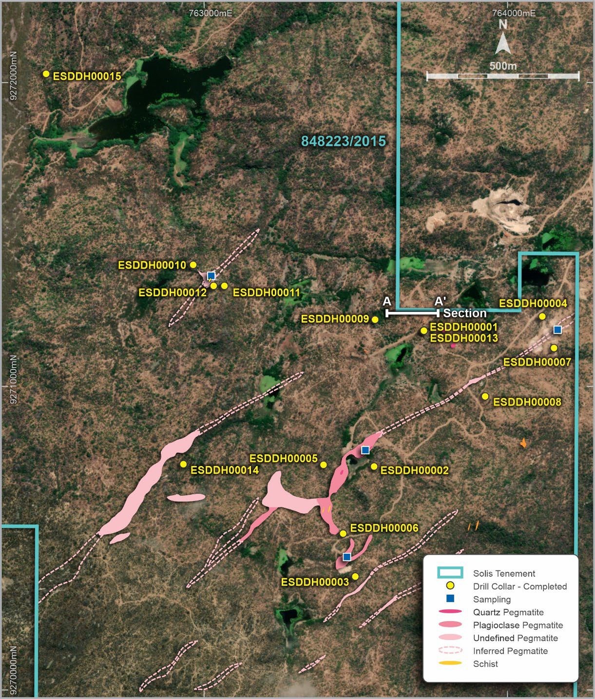 Más trabajoLa naturaleza y escala de los trabajos futuros previstos (por ejemplo, pruebas de extensiones laterales o de profundidad o perforaciones escalonadas a gran escala).Diagramas que resaltan claramente las áreas de posibles ampliaciones, incluidas las principales interpretaciones geológicas y futuras áreas de perforación, siempre que esta información no sea comercialmente sensible.Solís continuará con su muestreo geoquímico del entorno geológico regional, incluidas todas las pegmatitas aflorantes conocidas en el proyecto Mina Vermelha.El programa de perforación en Estrela y Mina Vermelha ya finalizó y se completaron 3.691m.