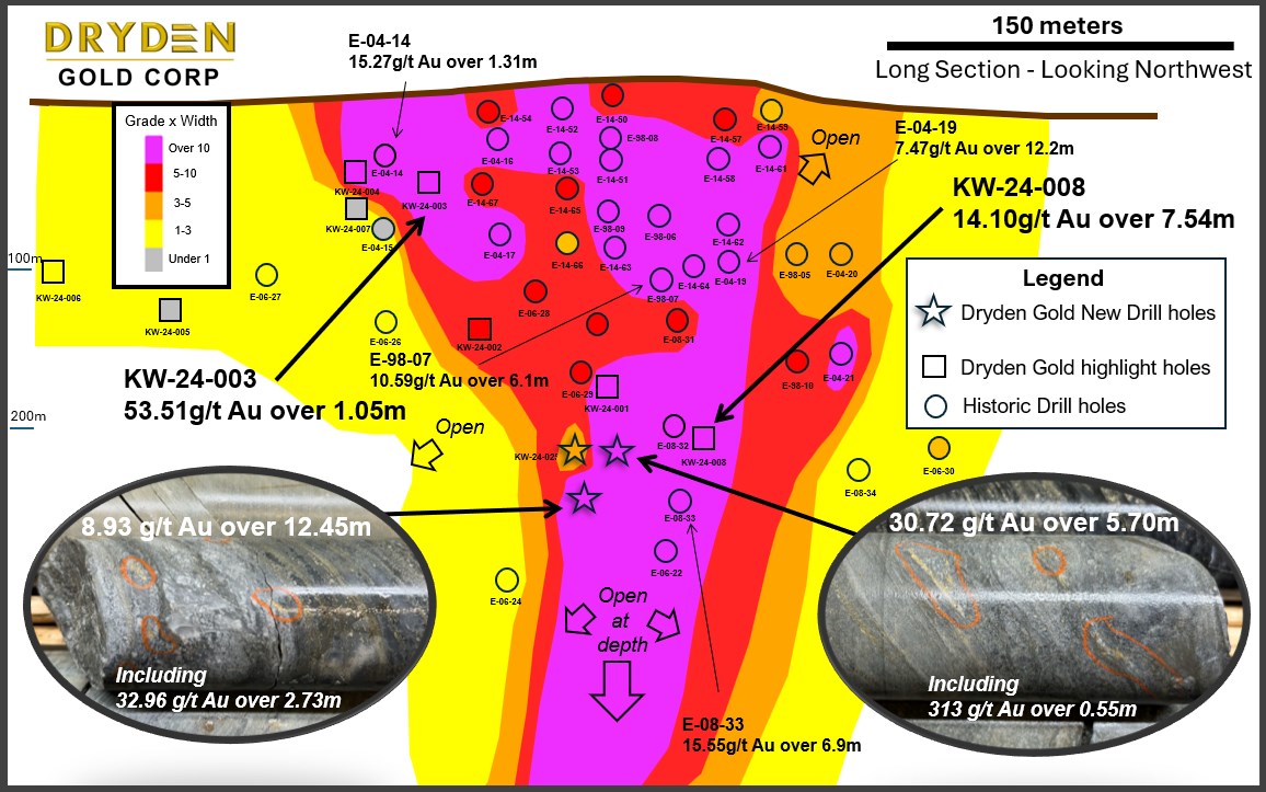 • El pozo KW-24-024 interceptó la zona mineralizada a aproximadamente 190 metros de la superficie y arrojó 8.93 g/t de oro en 12.45 metros, incluyendo 32.96 g/t de oro en 2.73 metros. Además, este pozo interceptó una estructura de pared colgante que arrojó 1,67 g/t Au en 2,75 metros, incluyendo 8,41 g/t de oro en 0,43 metros. Este es el pozo más profundo de Dryden Gold hasta la fecha y es la intercepción de alta ley más ancha y consistentemente diseminada de Dryden en Elora. Un video resumen de los resultados de hoy se puede encontrar aquí.