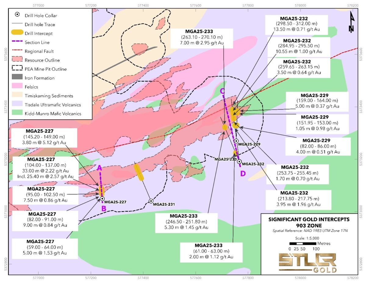 Keyvan Salehi, P.Eng., MBA, Presidente, CEO y Director de STLLR, comentó: «Continuamos interceptando mineralización de mayor ley en el Depósito 903 de nuestro programa de perforación de relleno asistido por IA. Más importante aún, continuamos confirmando la mineralización en áreas donde tenemos el potencial de convertir los recursos a niveles de confianza más altos1