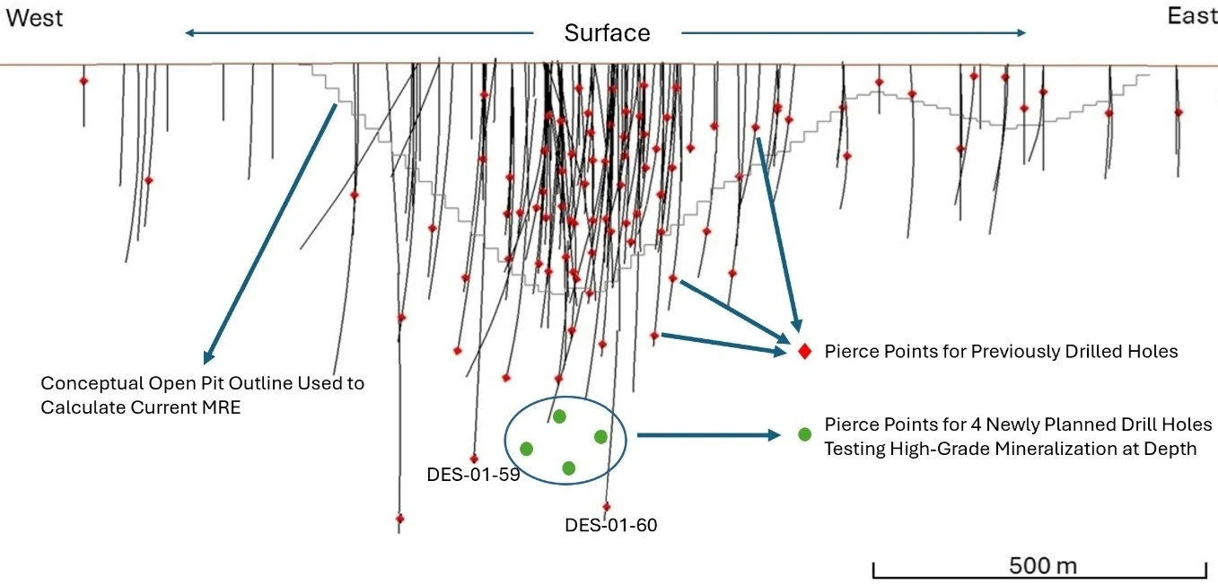 La Figura 1 a continuación proporciona una ilustración de sección larga de los puntos de perforación mineralizados para los pozos de perforación DES-01-60 y DES-01-59, su ubicación espacial en relación con la mayoría de los pozos de perforación anteriores que son mucho menos profundos, su profundidad debajo del tajo abierto conceptual que se utilizó para la generación del MRE actual en Destiny, y una representación de los cuatro pozos de perforación de nuevo diseño destinados específicamente a apuntar a una zona que tiene el potencial de albergar áreas subterráneas de alta ley recursos explotables.