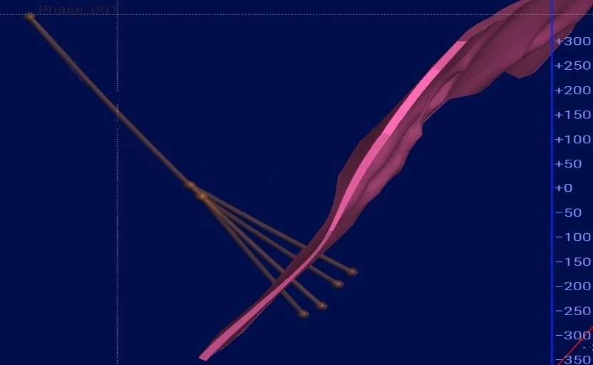 La Figura 2 a continuación proporciona una ilustración transversal de los cuatro pozos de perforación diamantina planificados para el programa de perforación de este verano, que consistirá en un pozo «piloto» perforado desde la superficie y tres pozos «acuñados» que se extenderán fuera del pozo piloto utilizando cuñas de perforación direccional colocadas a profundidades específicas en el pozo piloto. El programa totalizará entre 1.700 y 2.000 metros de perforación. El objetivo principal del programa será probar la brecha de 200 a 250 metros en la extensión vertical de la mineralización que se interpreta que se extiende desde el fondo del tajo abierto conceptual que restringe el MRE a ~ 350 metros de profundidad por debajo de la superficie, y las intercepciones de alta ley profundamente asentadas que se encontraron anteriormente a 500 a 600 metros de profundidad por debajo de la superficie.