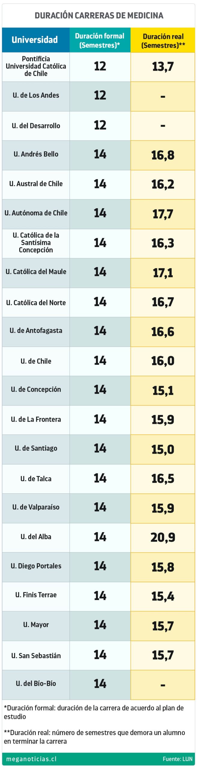 A continuación, te dejamos la duración de la carrera de Medicina en las distintas universidades de Chile. Cabe destacar que en el caso de la Universidad de los Andes y Uniuversidad del Desarrollo, la nueva duración de 12 semestres será a partir de 2024.