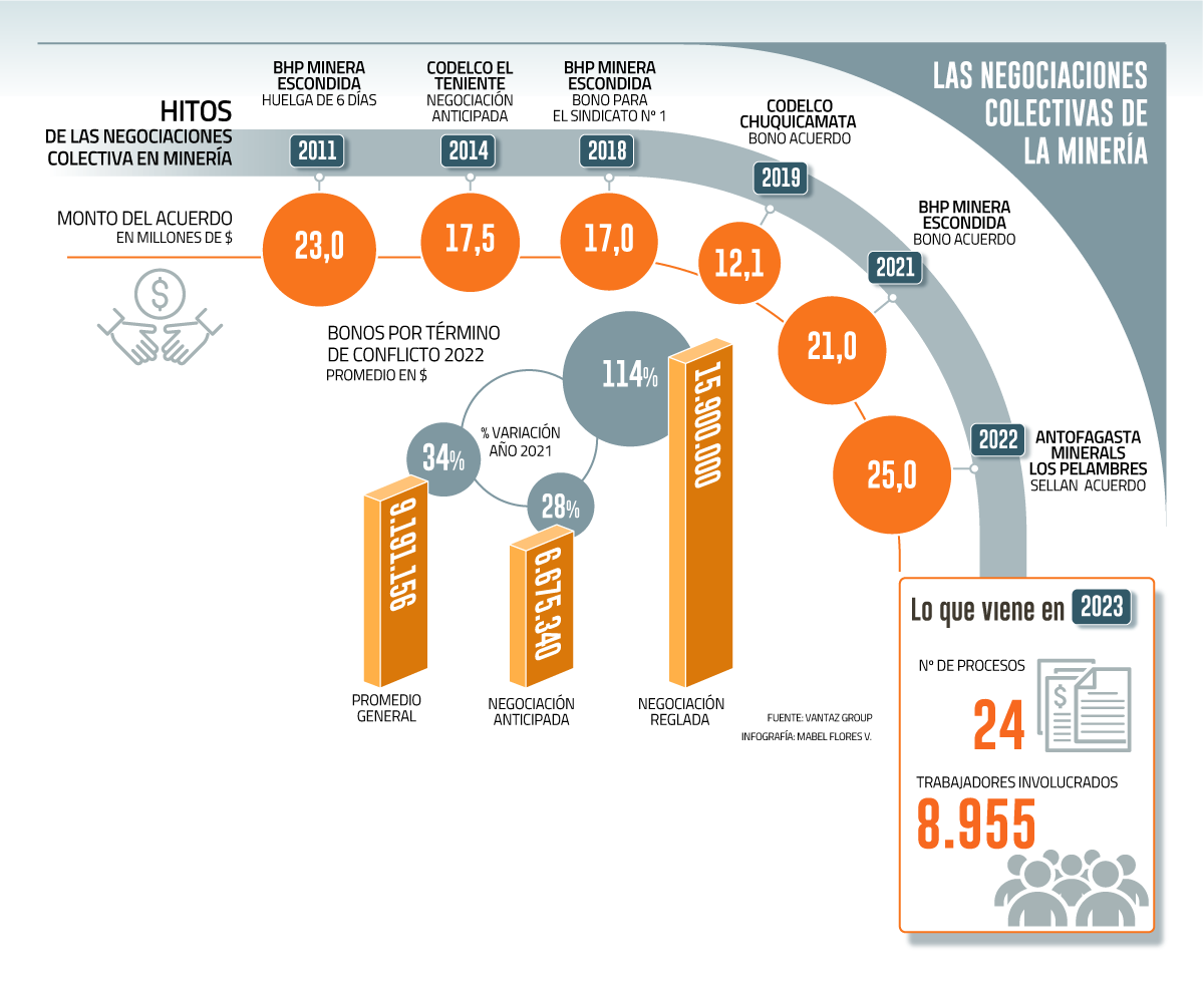 En 2022 se produjeron 29 negociaciones colectivas. Una de las empresas que enfrentó más procesos de este tipo fue Codelco, con ocho tratativas con distintos sindicatos, todas realizadas de manera anticipada. En la mayoría de los casos no hubo reajuste salarial, sino que se entregó otro tipo de beneficios a los trabajadores, precisó Vantaz.