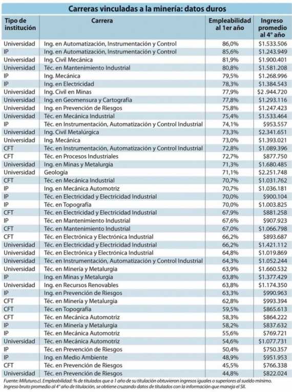 Los casos antes mencionados son carreras universitarias, pero un mecánico industrial de un centro de formación técnica, tiene una empleabilidad del 70% en la minería al primer año de egresado y su salario llega a $1.031.000 pesos chilenos, que traducido a dólares son US$1.240, aproximadamente.