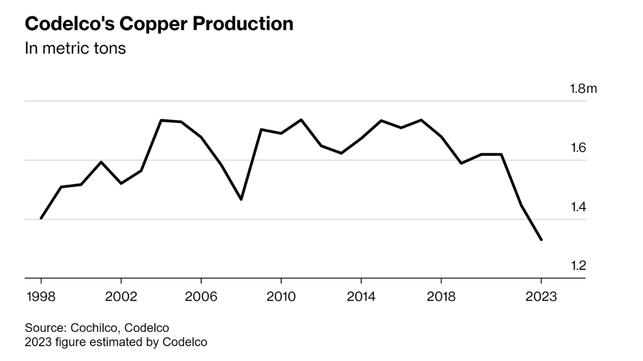 Calidad del mineral y producción: La producción de Codelco ha caído al nivel más bajo en un cuarto de siglo debido a una lucha en toda la industria contra la decreciente calidad del mineral. En este contexto, la empresa estatal enfrenta un desafío aún mayor que la mayoría de sus competidores, ya que intenta recuperarse tras años de falta de inversión.