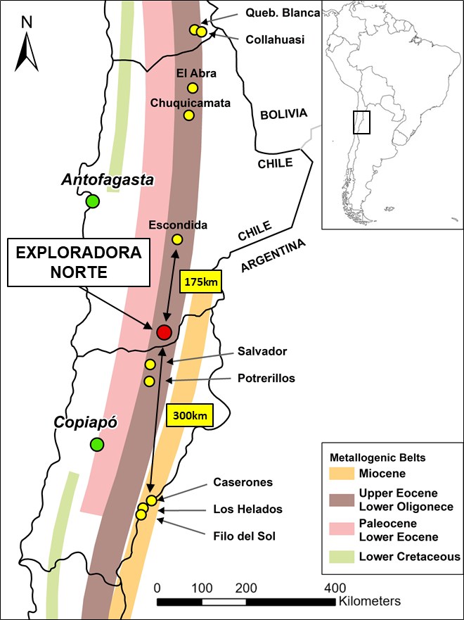 Además de la propiedad Exploradora Norte, CopperEx posee el 100% de sus propiedades Kio Buggy (norte de Chile) y La Rica (provincia de Apurimac, Perú), también sin regalías asociadas. La propiedad CopperEx Exploradora Norte está inmediatamente adyacente al norte y al este de la propiedad Codelco Exploradora, que alberga un recurso estimado por Codelco que contiene 190-280 Mt @ 0,40% Cu. (2)