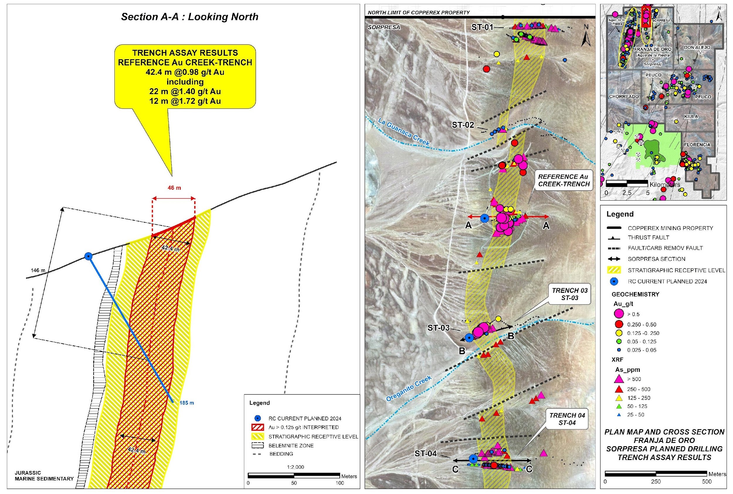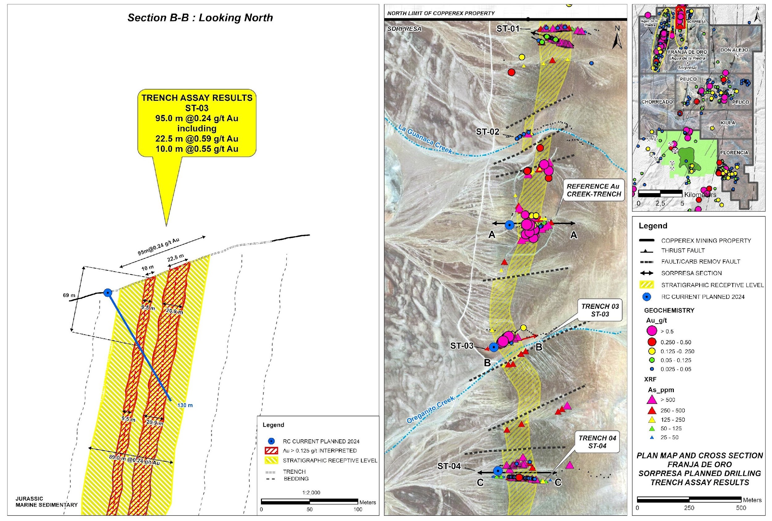 Además, CopperEx realizó excavaciones y muestreos en 2023 en la extensión norte de Sorpresa Trend y obtuvo: