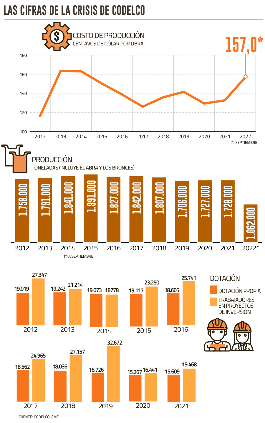 Codelco terminará este año con la menor producción en dos décadas, rondando los 1,440 millón de toneladas de cobre propio, un alza en su costo unitario y atrasos en sus proyectos estructurales como Rajo Inca, nuevo nivel El Teniente, División Andina, entre otros.