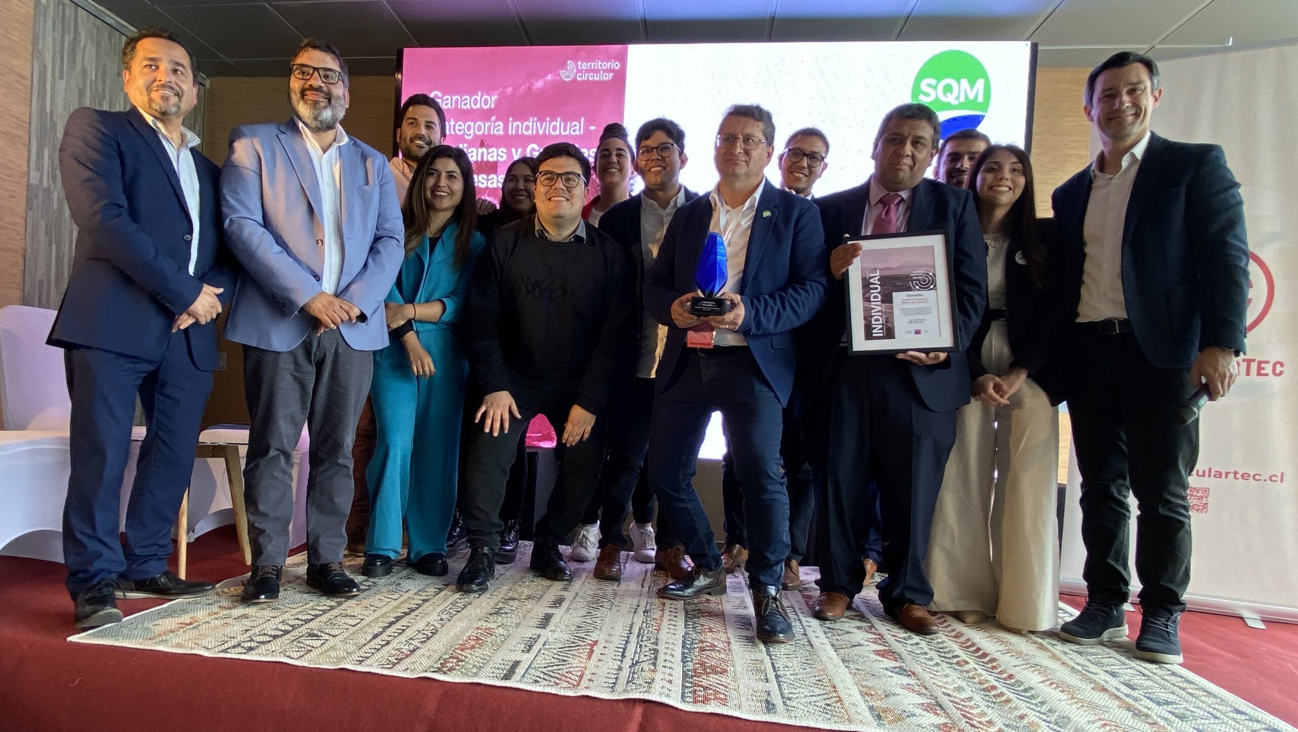 En la categoría Individual Mediana y Gran Empresa, el galardón se lo llevó SQM. “Nos enorgullece recibir este premio, el proyecto “Producción Sostenible de Sulfato de Litio” es fruto de un trabajo arduo, que empezó como pruebas de laboratorio, y hoy está en la operación industrial. Este proyecto se realizó con el trabajo conjunto de diferentes áreas, con jóvenes profesionales principalmente chilenos y una amplia presencia femenina. Vimos la oportunidad de abordar un problema que se viene gestando hace años, la sulfatación del Salar de Atacama, cómo transformarlo en un producto comercial para ir reduciendo la huella de carbono e hídrica, reutilizando la infraestructura existente y revalorizando acopios existentes. Recibir este premio nos muestra que vamos por buen camino hacia la Economía Circular y este proyecto es un paso importante”, comentó Osvaldo Yañez Saez, Gerente de Innovación y Desarrollo SQM.