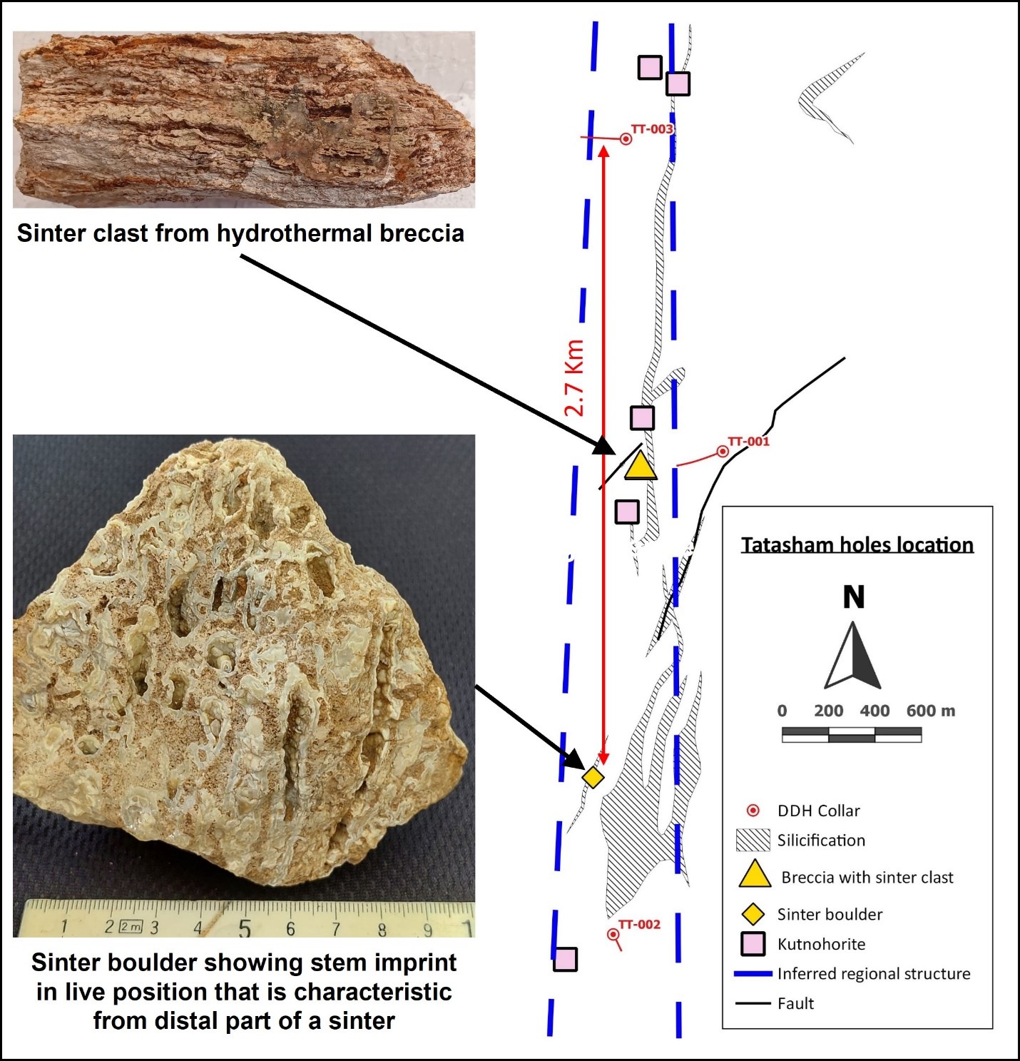 El sistema hidrotermal de Tatasham se caracteriza por una fuerte silicificación que rodea las brechas hidrotermales. La parte superior conserva finas capas irregulares de sílice amorfa que tiene las características de un sinterizado. Se han identificado varias texturas típicas del sínter de sílice, en particular, «tejido de red» y litofacies de geyserita, esta última interpretada como próxima a la abertura original (ver fig. 1). En las cercanías se encontraron otros dos sinterizados, uno de los cuales está representado por un canto rodado ubicado a 2,7 km del collarín de TT-003 (ver fig.2).